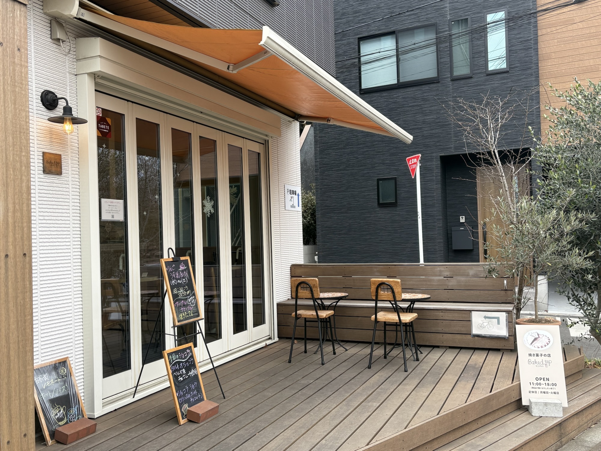 場所は住宅街の一角で、木のデッキとオーニングが目印。