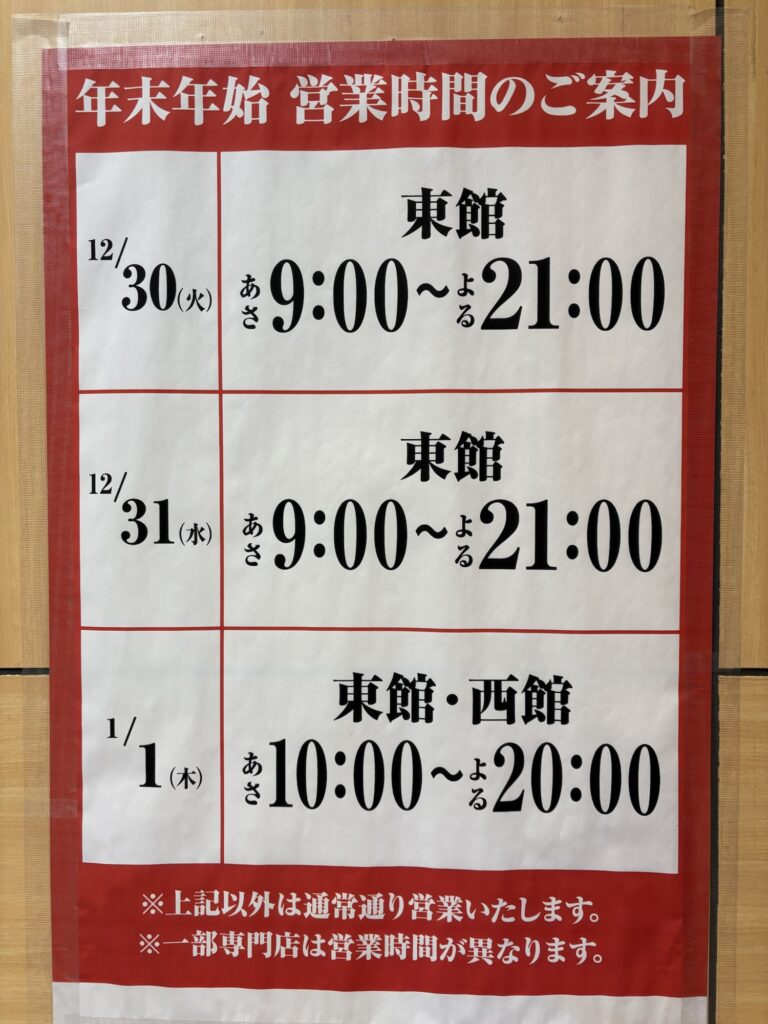 年末は閉店時間が早まり、年始は開店が遅くなる店舗が多くなっています。