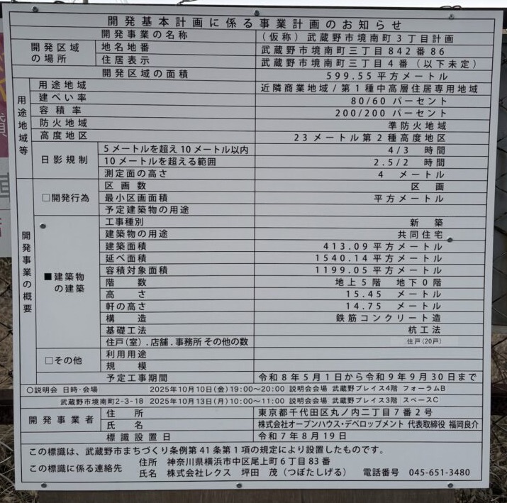 オープンハウスデベロップメントの名称が入った建築計画のお知らせ看板を見かけました。
