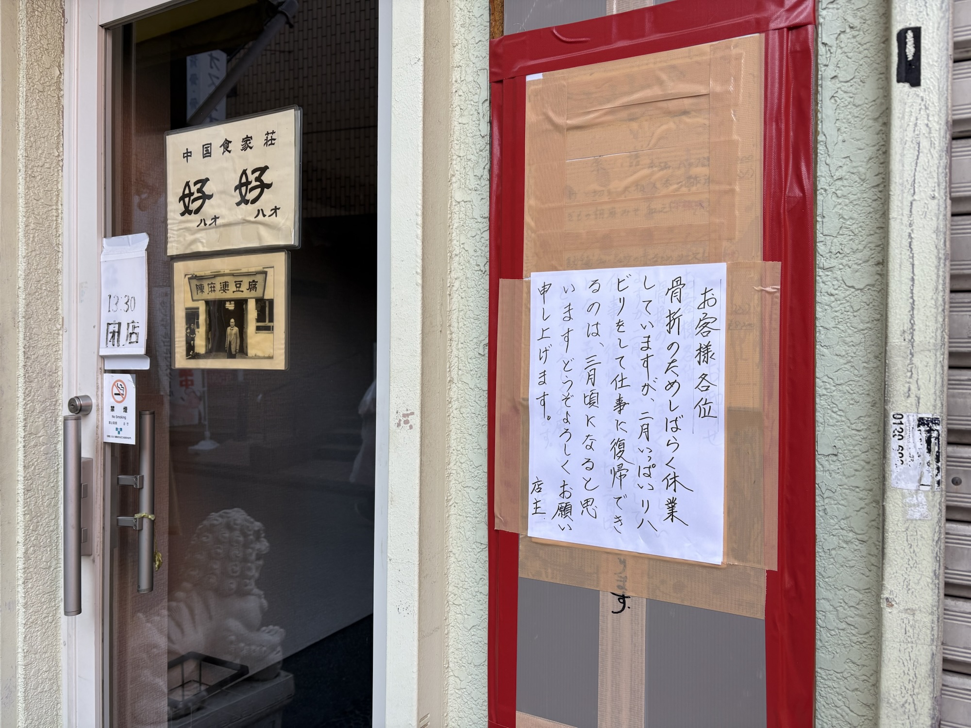 開店・閉店 中国食家荘「好好(ハオハオ)」一時休業中の貼り紙|3月頃の再開予定