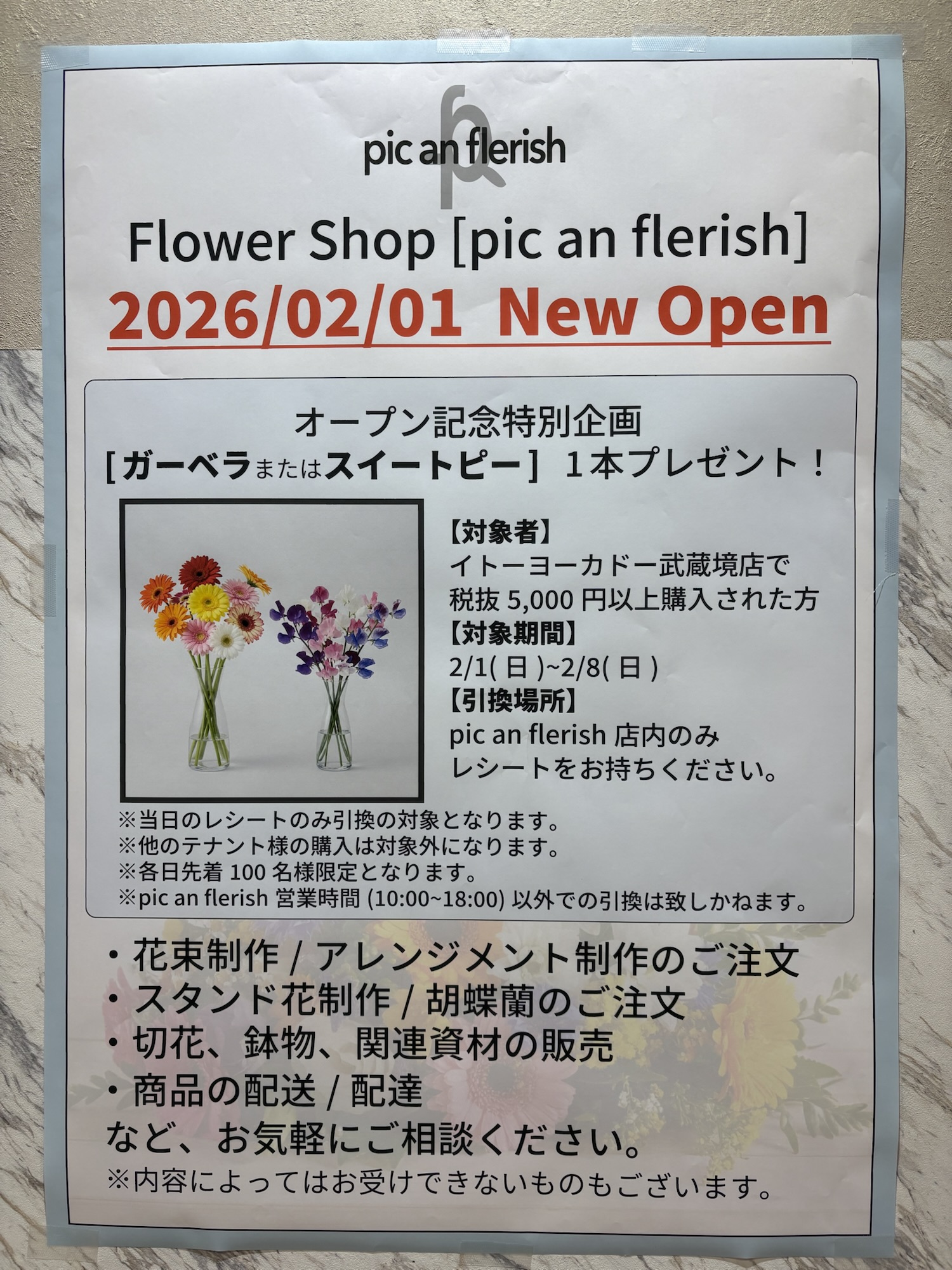 開店・閉店 イトーヨーカドー武蔵境の花屋がリニューアル|「pic an flerish」として2/1オープン予定