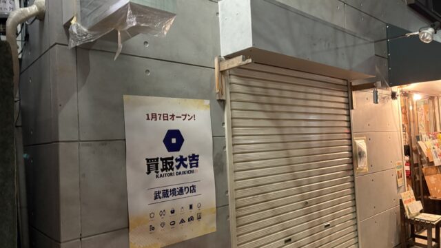 武蔵境通り沿い、以前「中華そば樹々」があった場所に、買取専門店「買取大吉」がオープンするようです。現地にはすでに告知ポスターが掲示されており、1月7日オープンと記載されていました。中華そば樹々が閉店してから、それほど時間を置かずの新テナント...