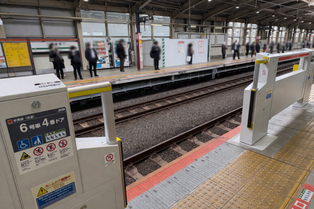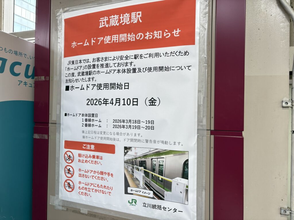 2026年3月、JR中央線・武蔵境駅にホームドアが設置されているのを現地で確認しました。