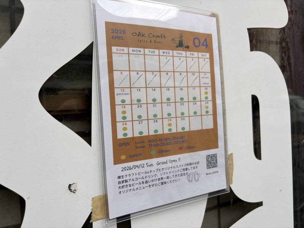 「OAK Craft(オーククラフト)Spice & Beer」 が、2026年4月12日にグランドオープン予定とのこと。